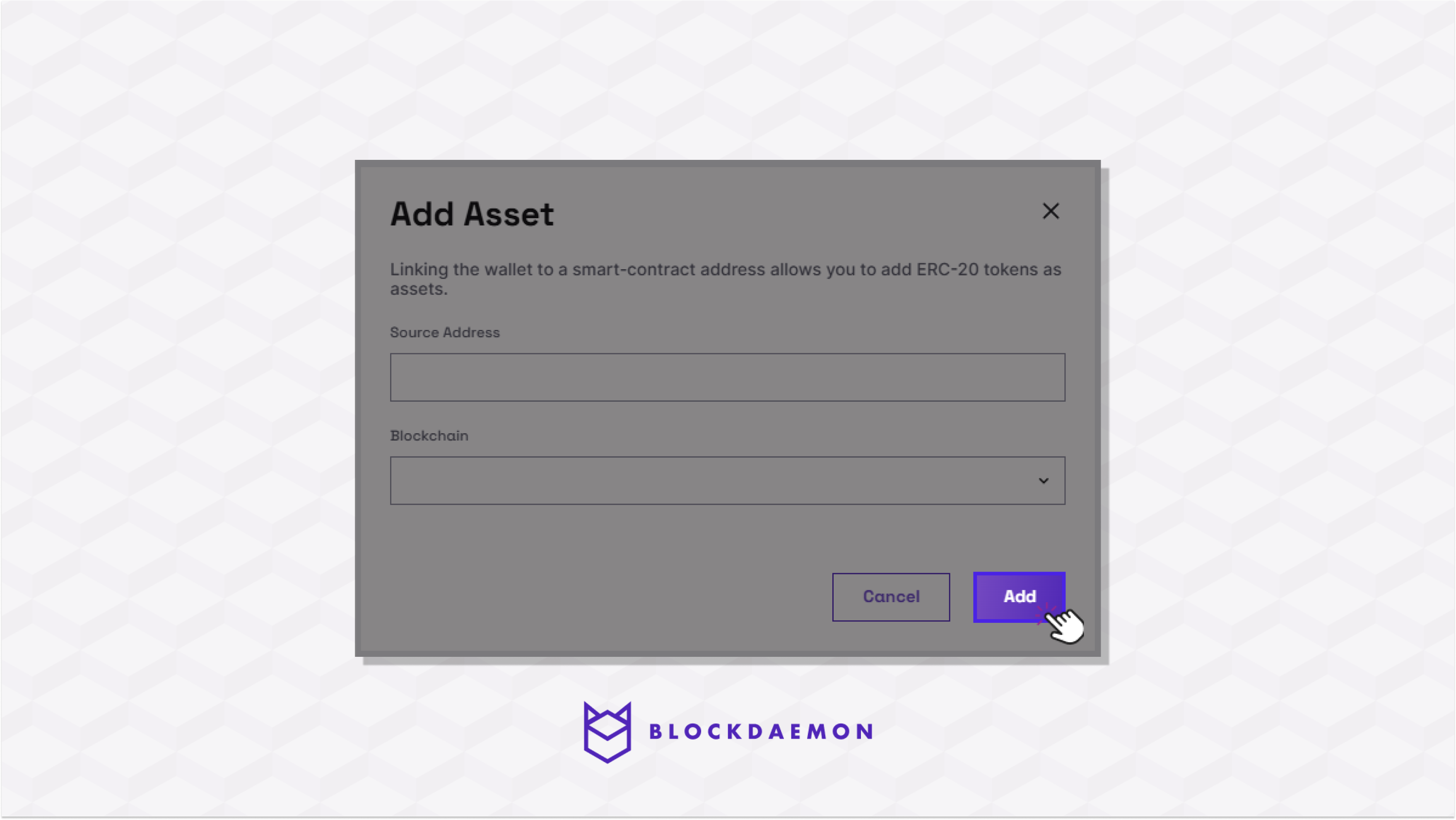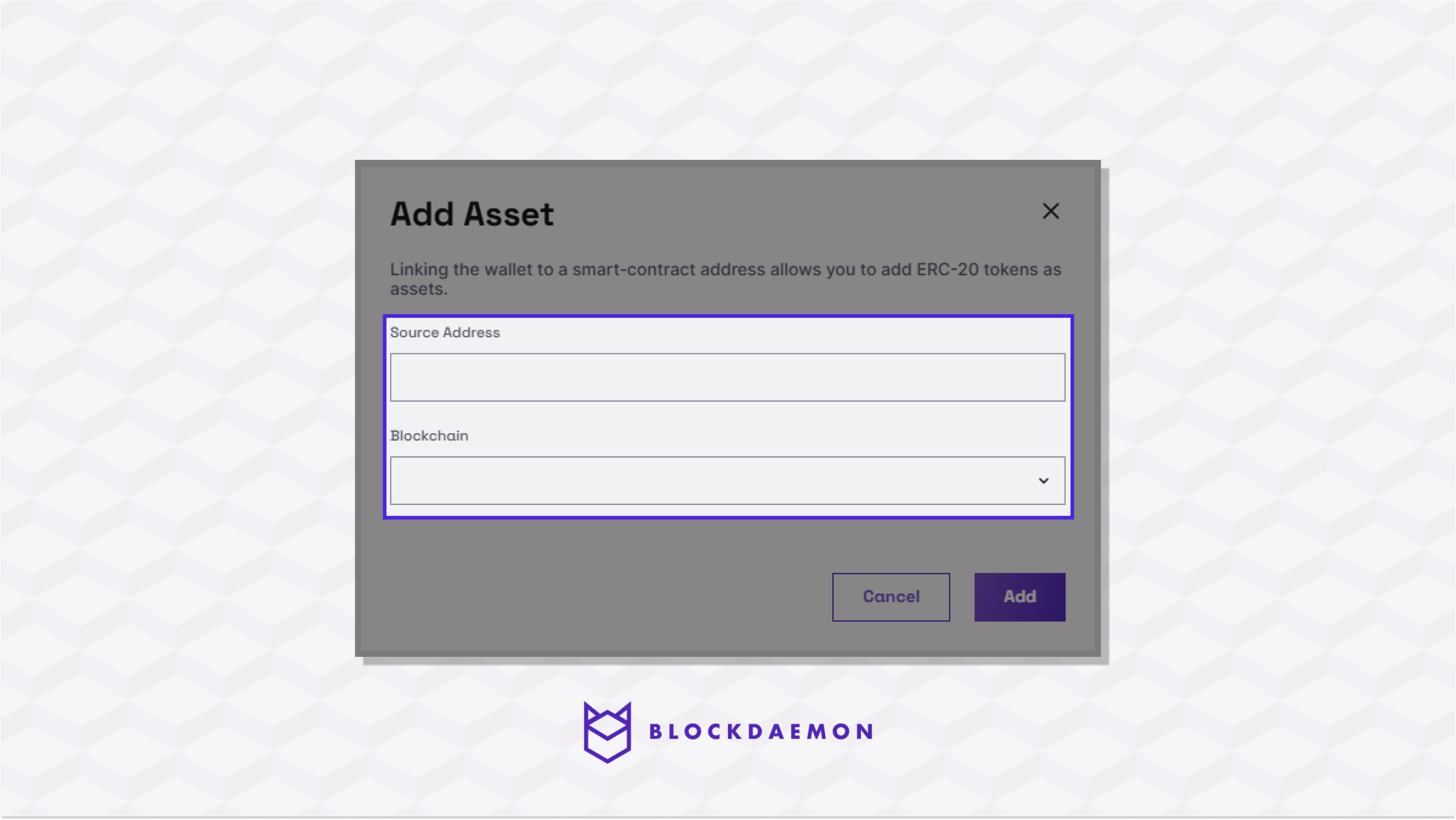 - Enter the smart contract address and the blockchain for the ERC20 token you want to add.