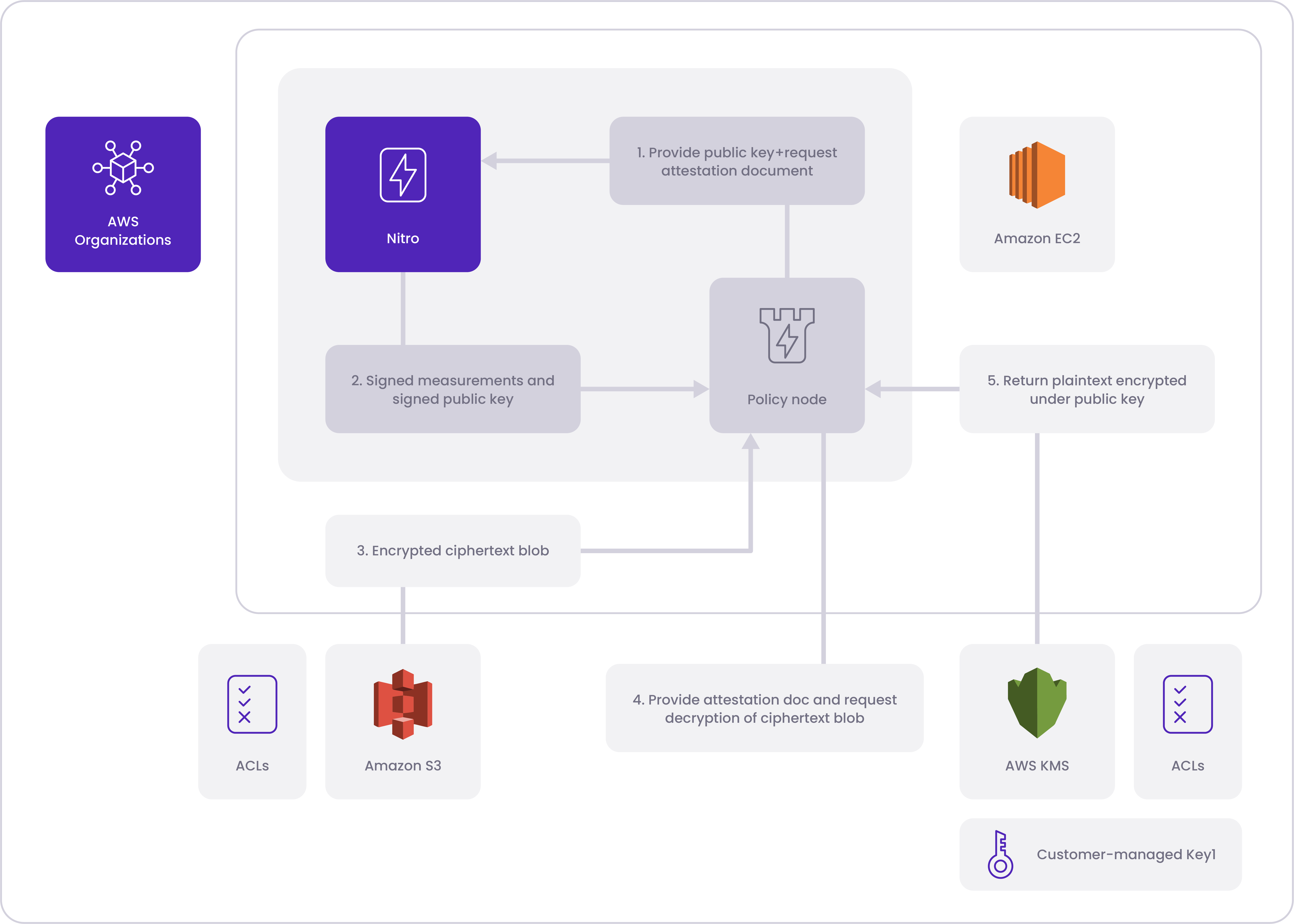 - Blob Decryption: If the CMK policy conditions are met, and the attestation document's signature is valid, AWS KMS proceeds to decrypt the encrypted blob using the appropriate CMK.