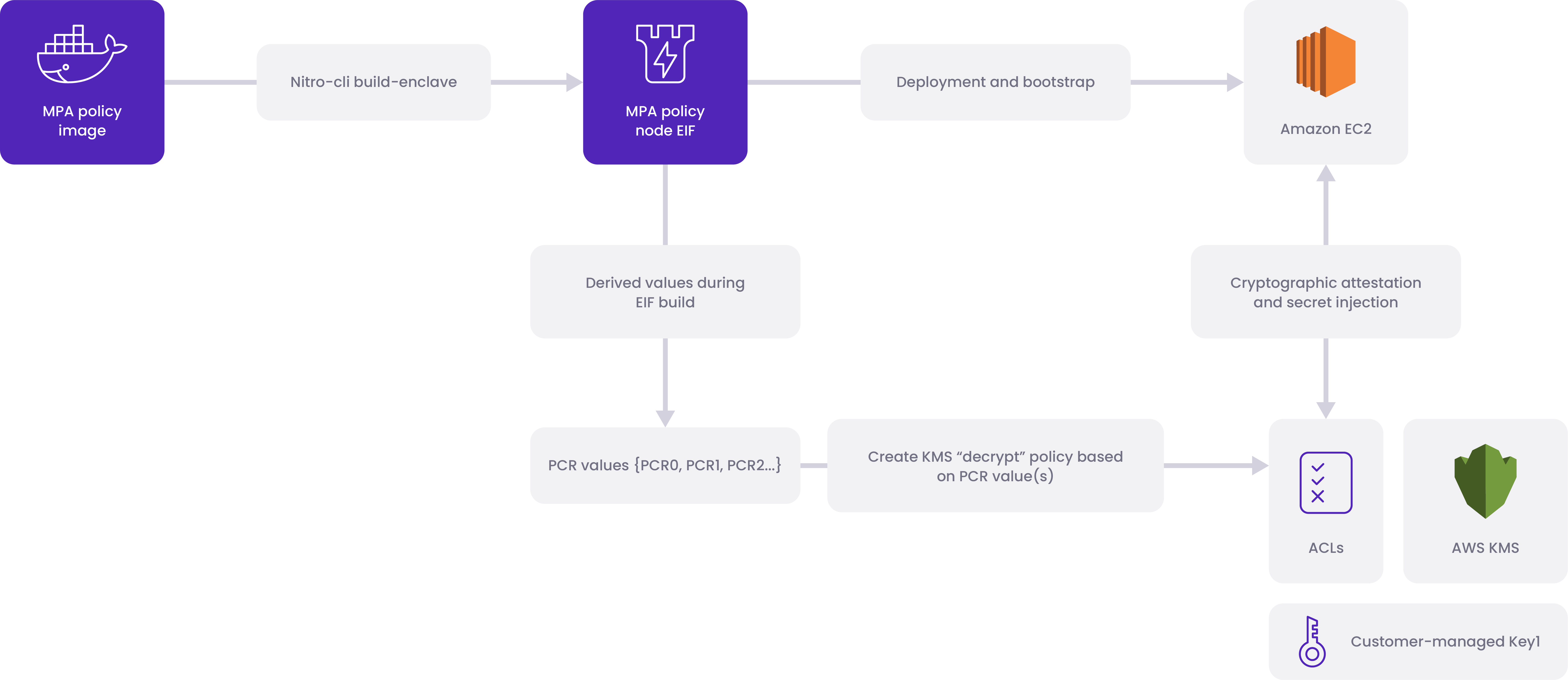 - Signed cryptographic attestation document: Upon receiving the request, the AWS Nitro hypervisor signs the requested PCR measurements as well as MPA policy node public key using its private key.