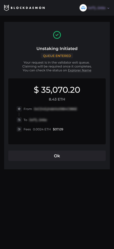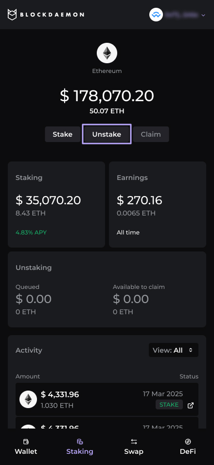 The Ethereum Unstake Flow lets users release staked ETH, rendering the assets eligible for final withdrawal and transfer back to the wallet. Unstaking is always the first step in a two-step sequence: Unstake → Claim.