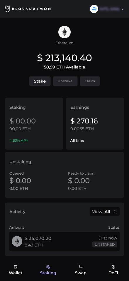 The user returns to the widget after their previously unstaked ETH has finished queued.