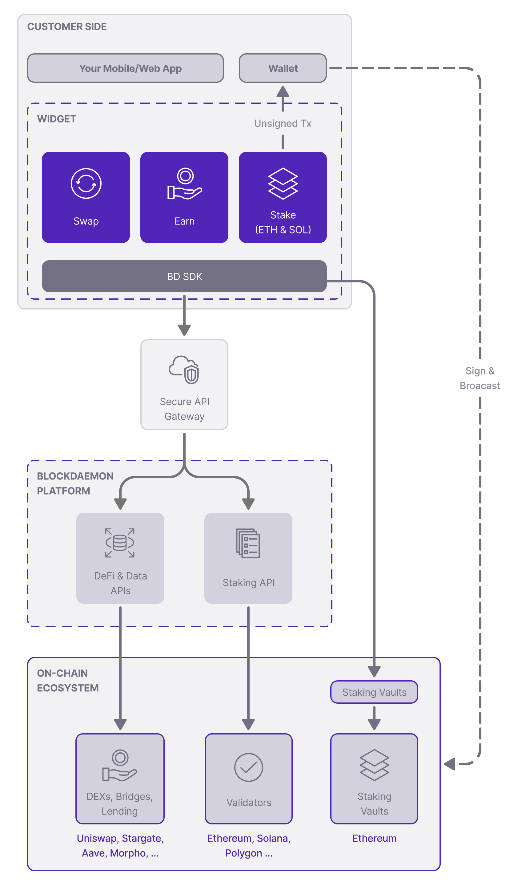 Blockdaemon Earn Stack is a complete, secure platform for offering staking, DeFi yield, and swaps through a single, non‑custodial integration.