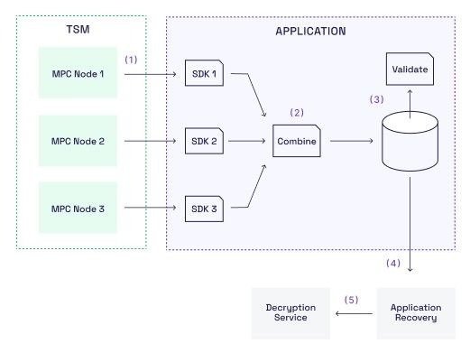 Technically, it is enough to collect partial recovery data from t+1 MPC nodes, where t is the security threshold of the TSM. However, usually, partial recovery data is collected from all MPC nodes.