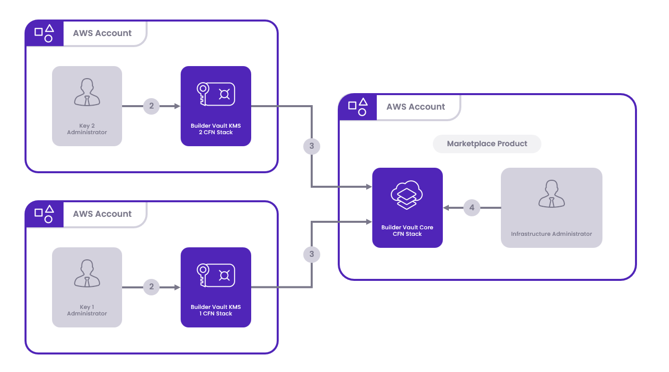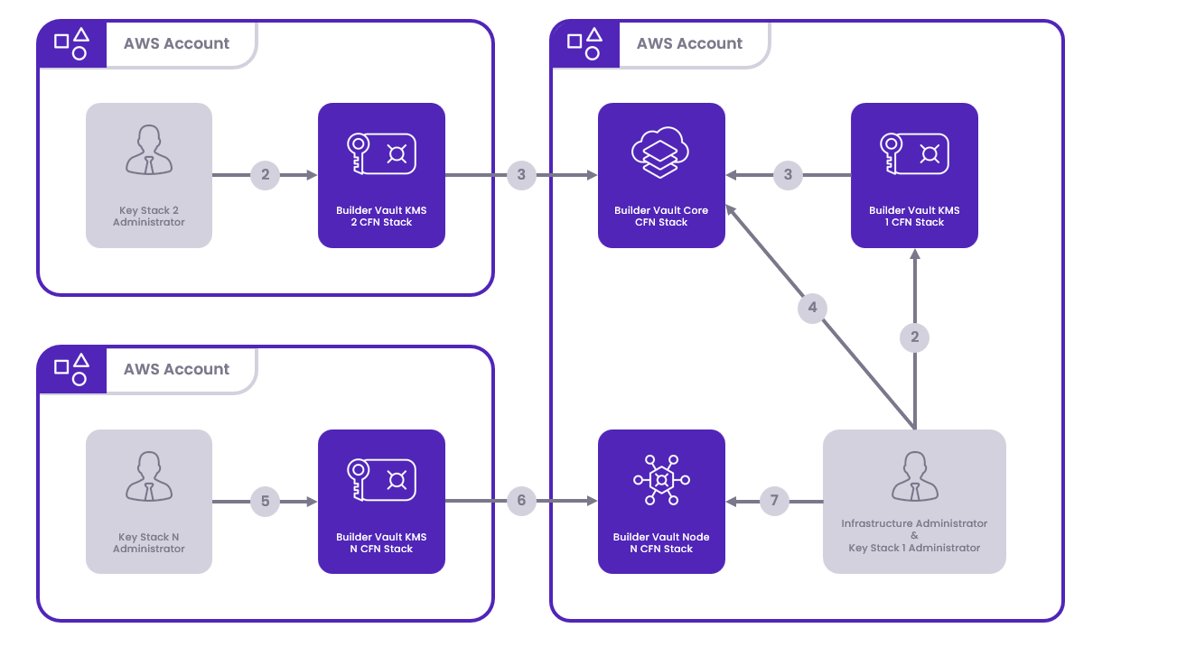 - Deploy Node Stacks: The Infrastructure Administrator deploys each Builder Vault Node stack, incorporating the keys obtained from the Key Administrators.