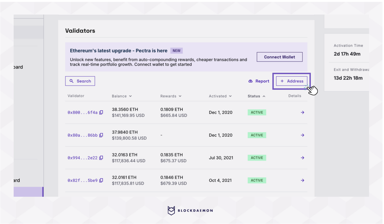 - When staking via the Blockdaemon App or staking API your validators will be auto-populated into your Dashboard.