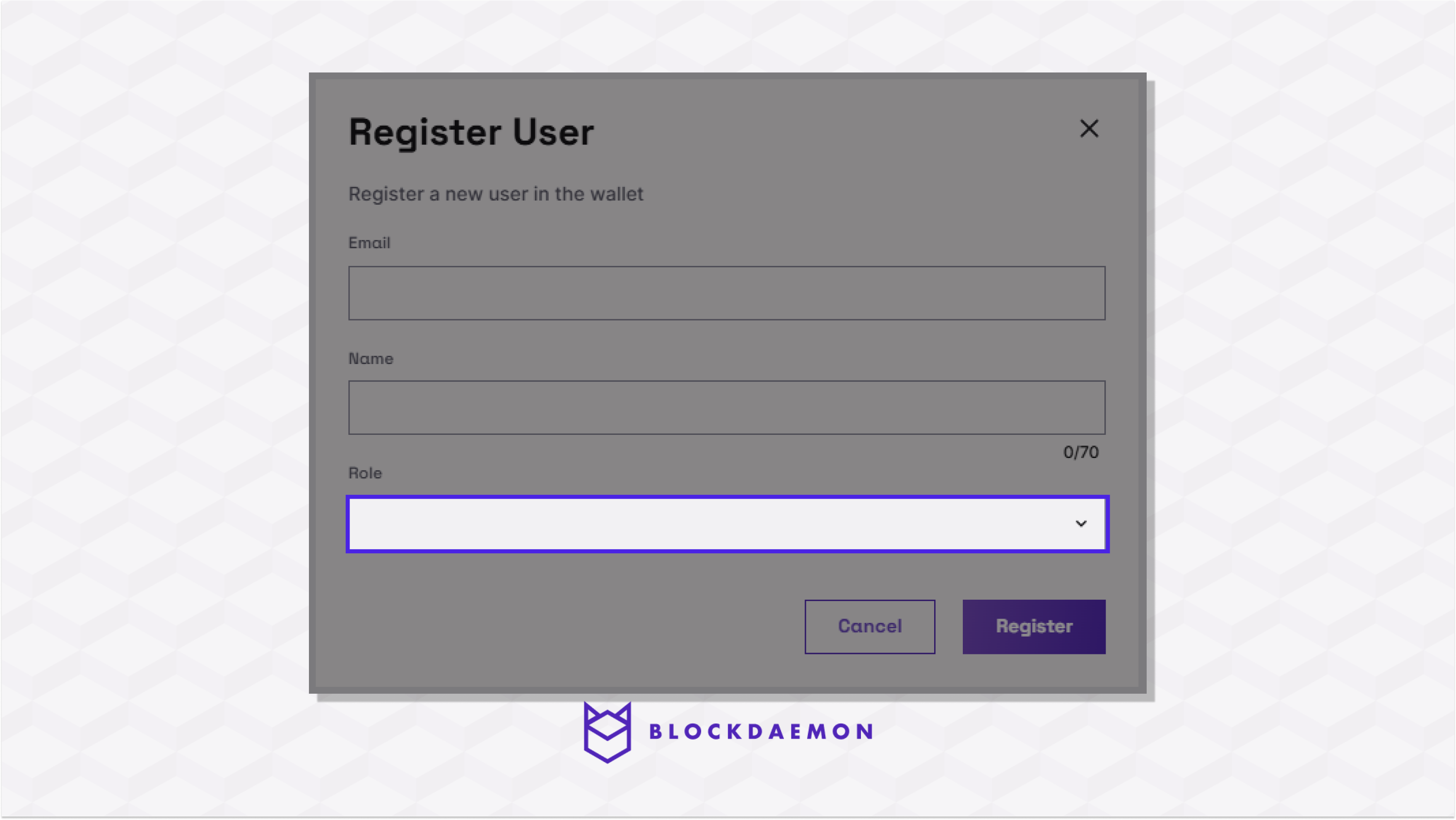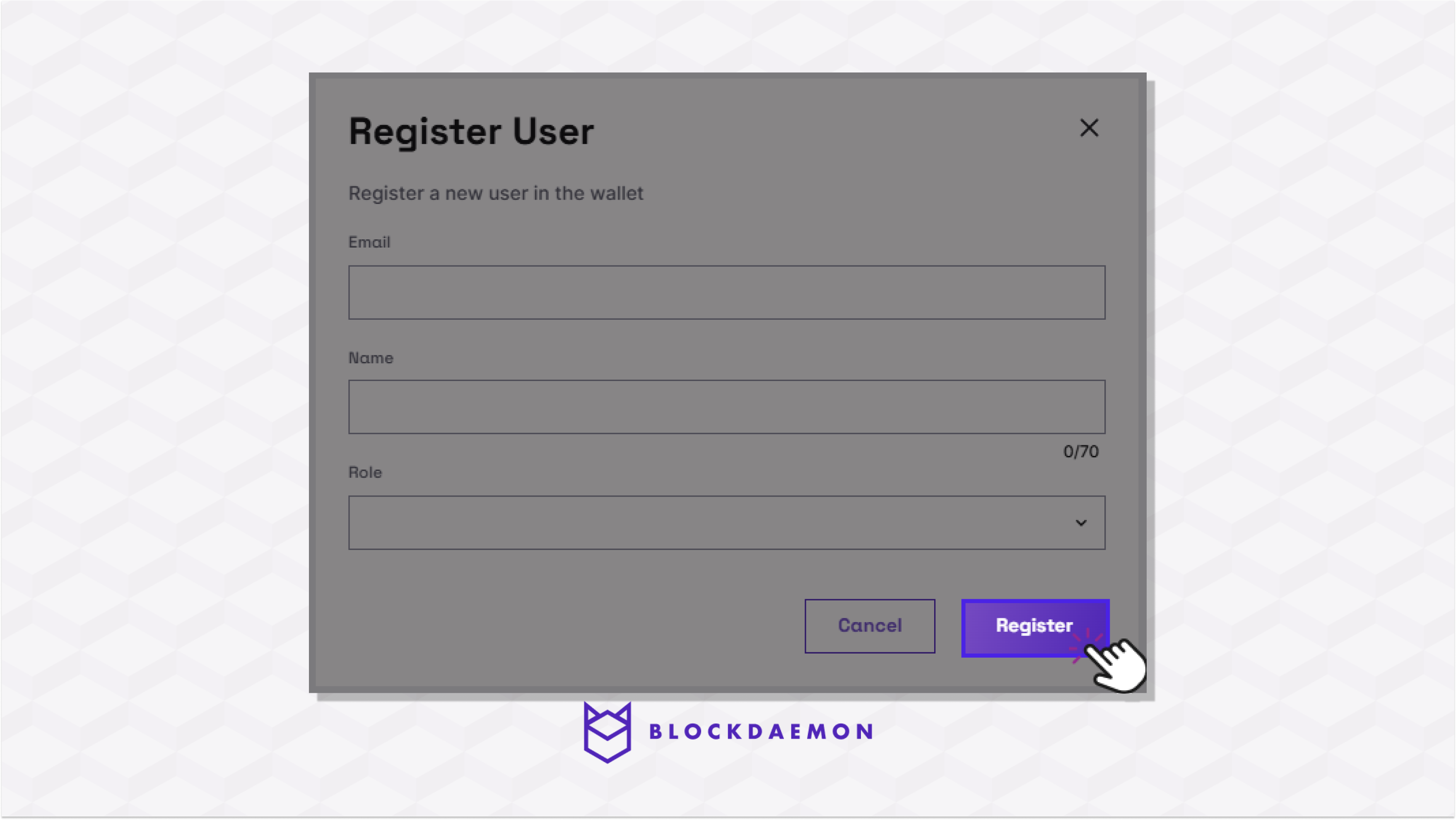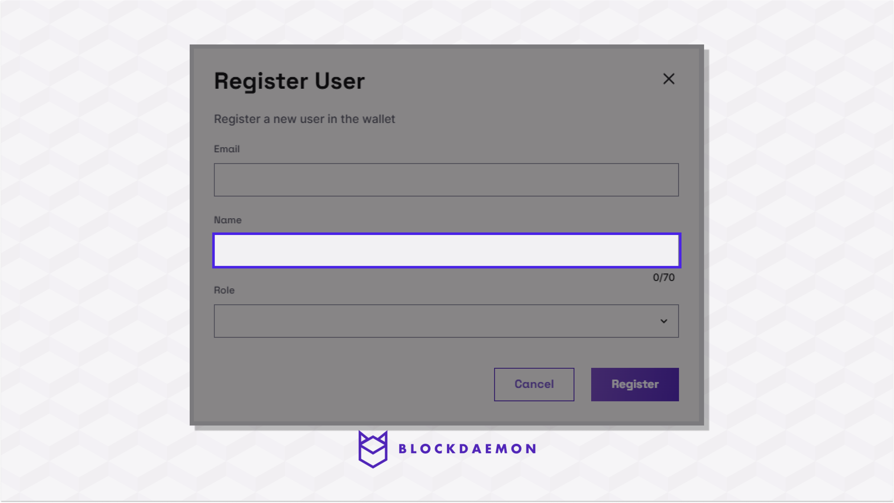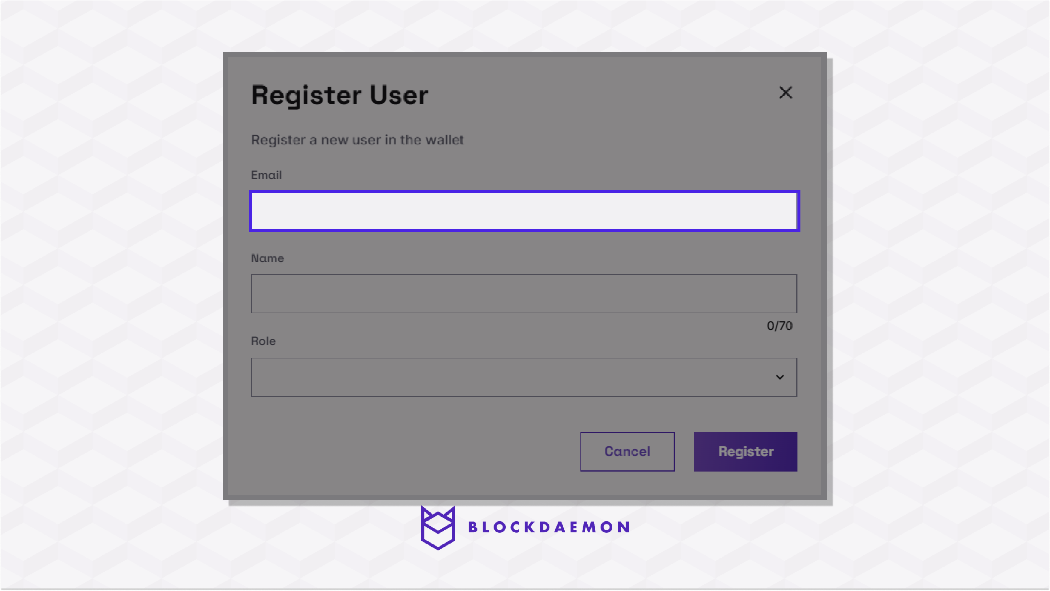 A user must be set up in the wallet settings menu to access the wallet. A user is registered with the email they use for the company’s identity provider and given a display name for the wallet and a role.