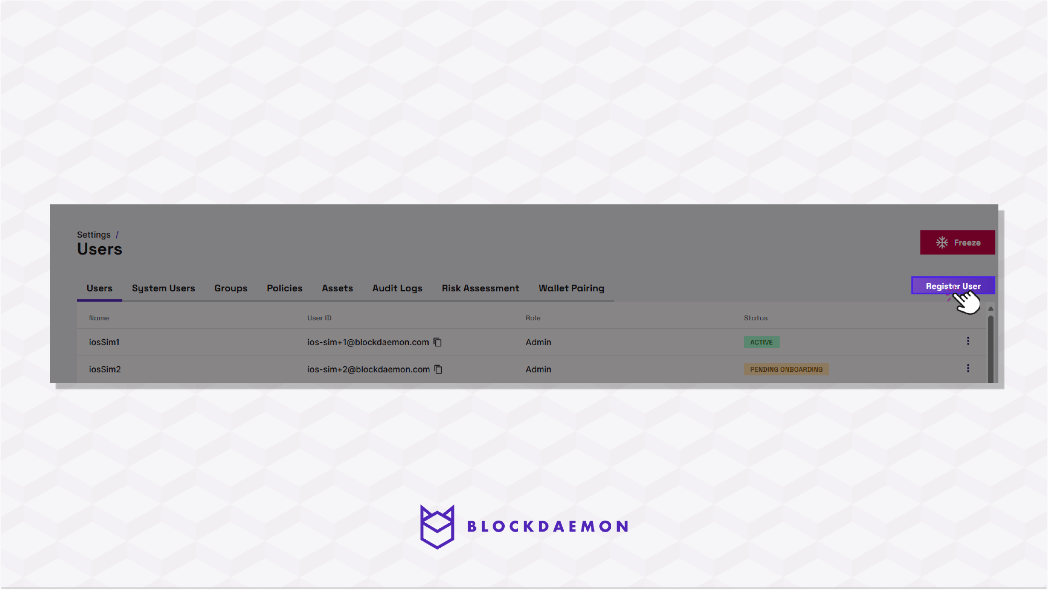 Note:The registered user will have the “Pending Onboarding” status and must go through the onboarding flow to access the wallet.