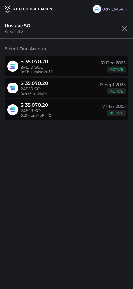 The user selects one Active stake account from the list.