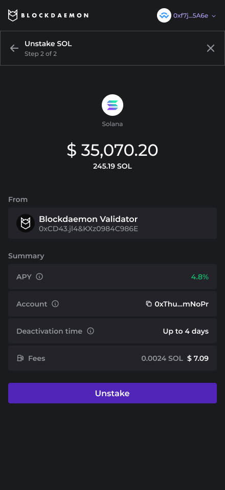 This Solana Unstaking Flow flow lets users deactivate a specific Solana stake account so that the staked SOL can later be withdrawn back to the wallet.