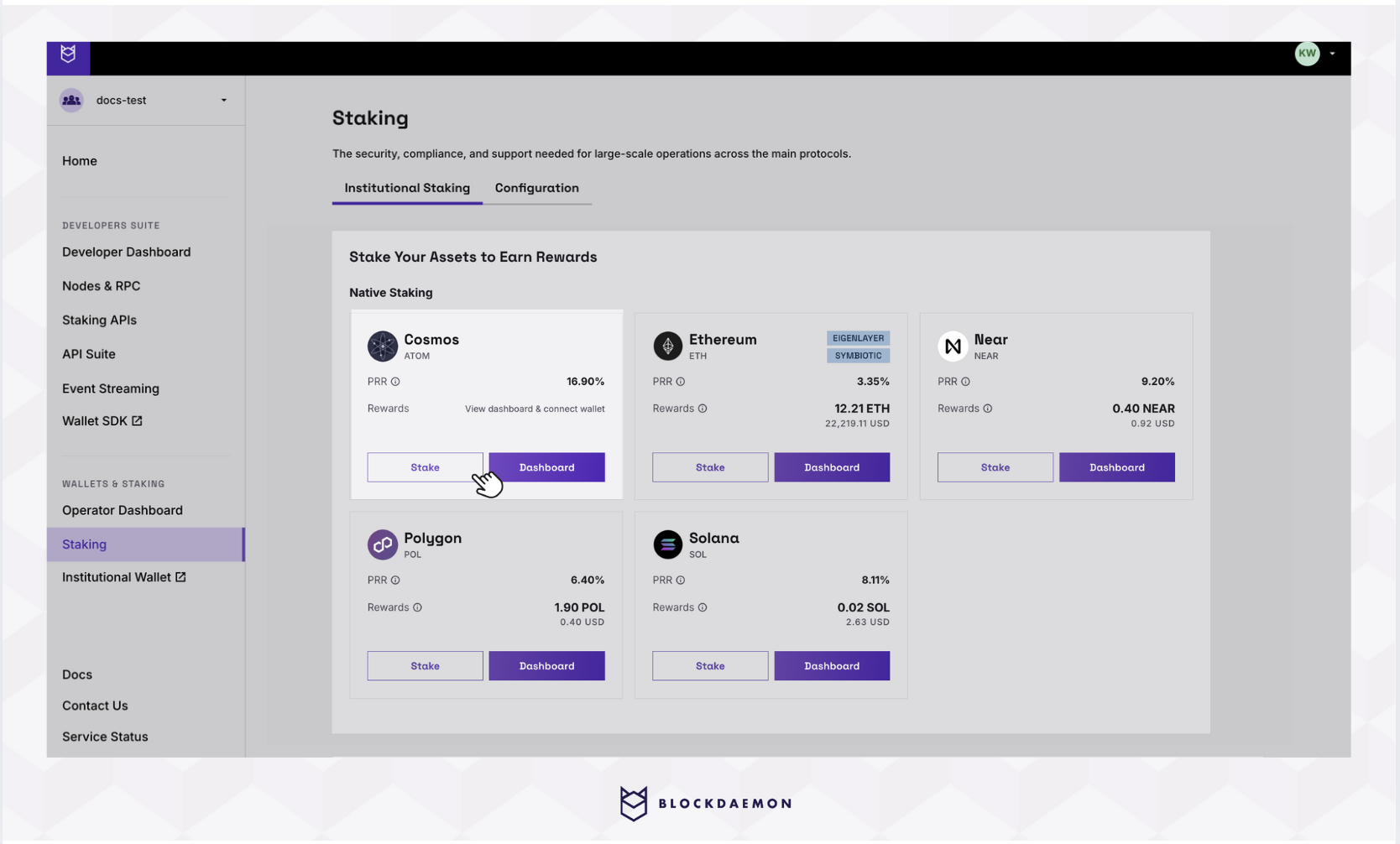 - Staking can be initiated from the Cosmos card as shown below via the Stake button and is also available from the Dashboard.