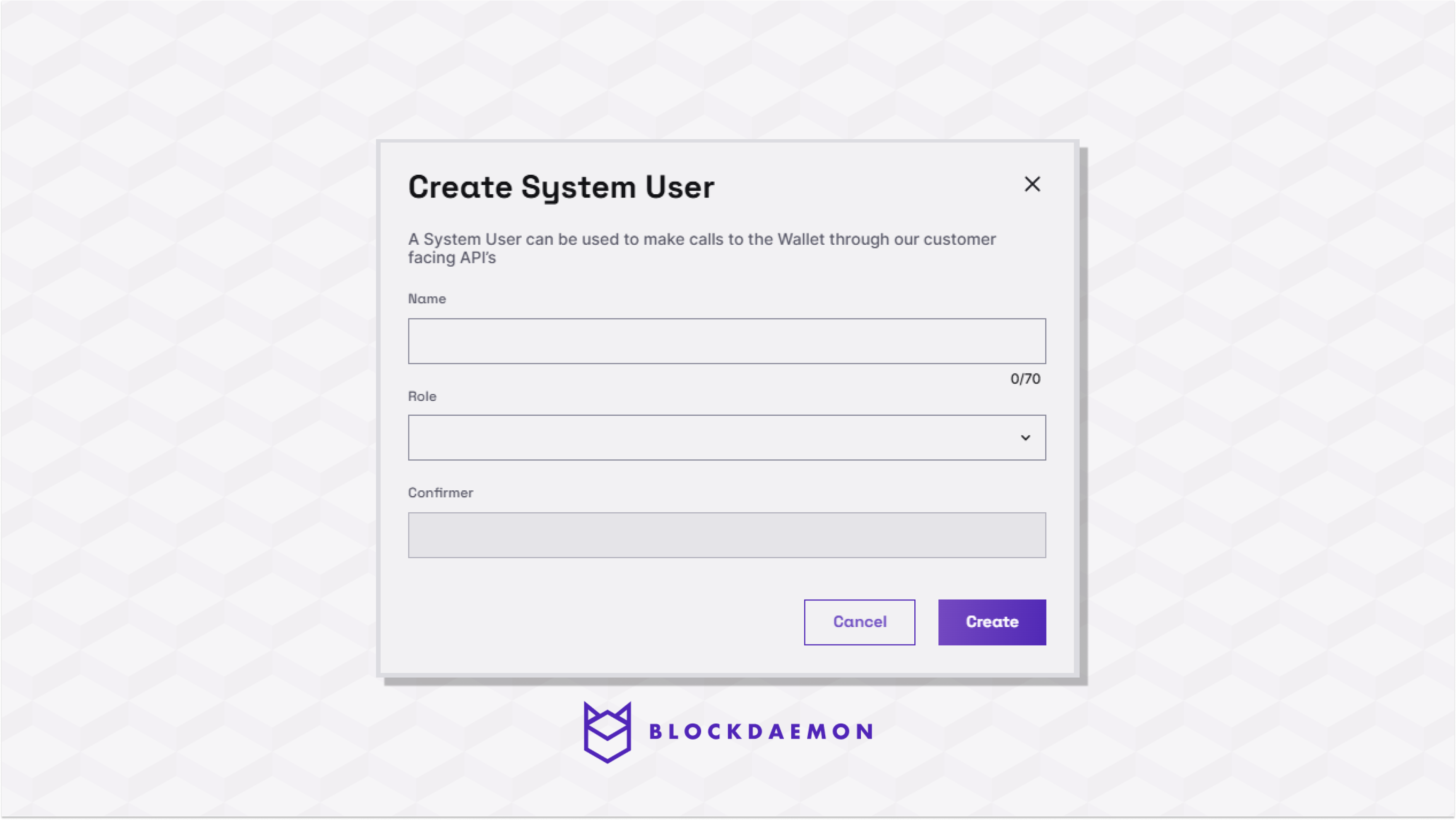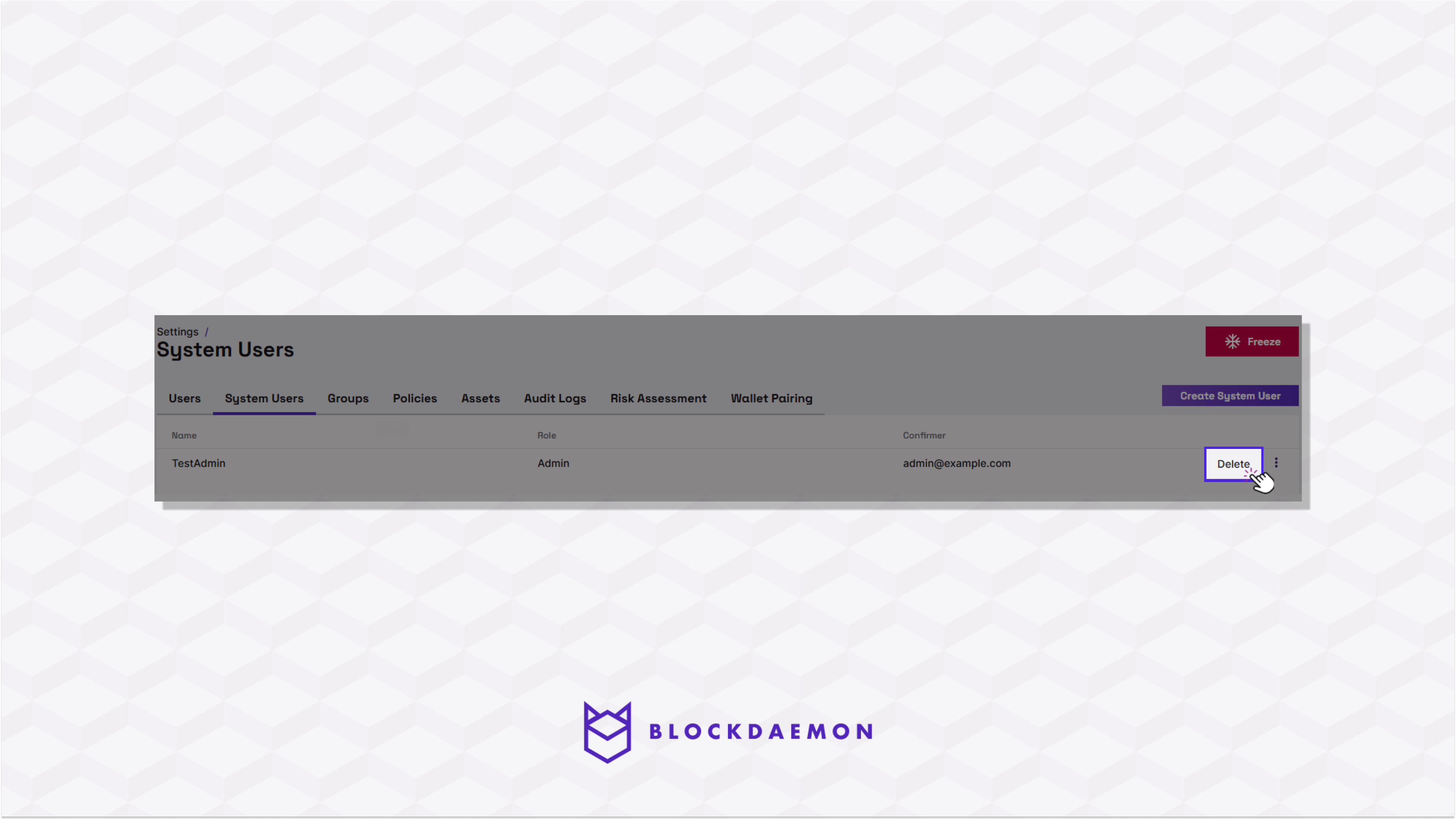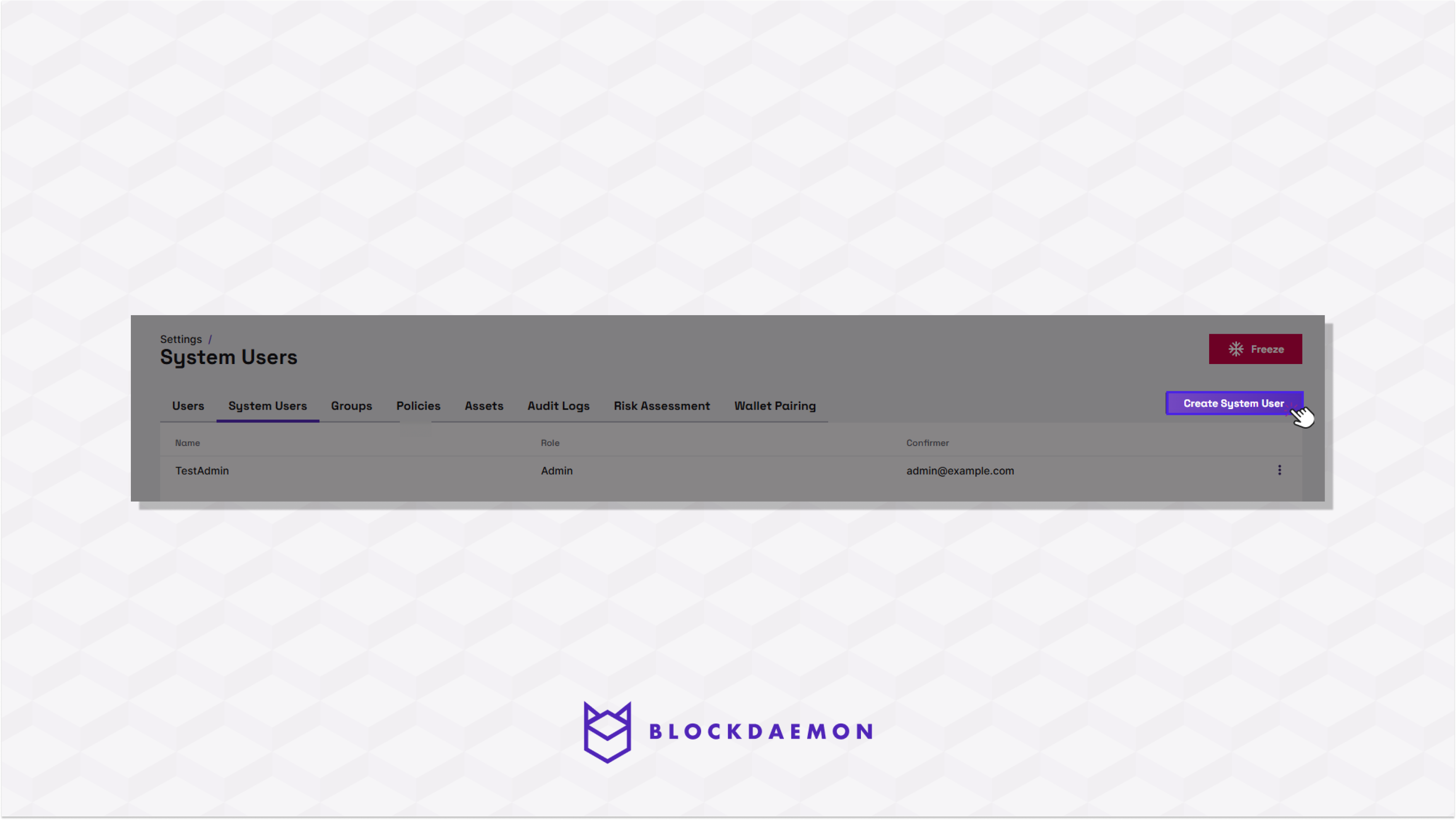 Note:Creating and deleting System users have no bearing on the position of system users inside the MPA (policy engine). Only the wallet service is responsible for keeping track of who sends API calls. The policy engine is concerned with the entity that validates or denies requests, and the information linked to that entity is specified in the config file. It cannot be modified via the wallet's user interface. Refer to the MPC Wallet Architecture for further details.