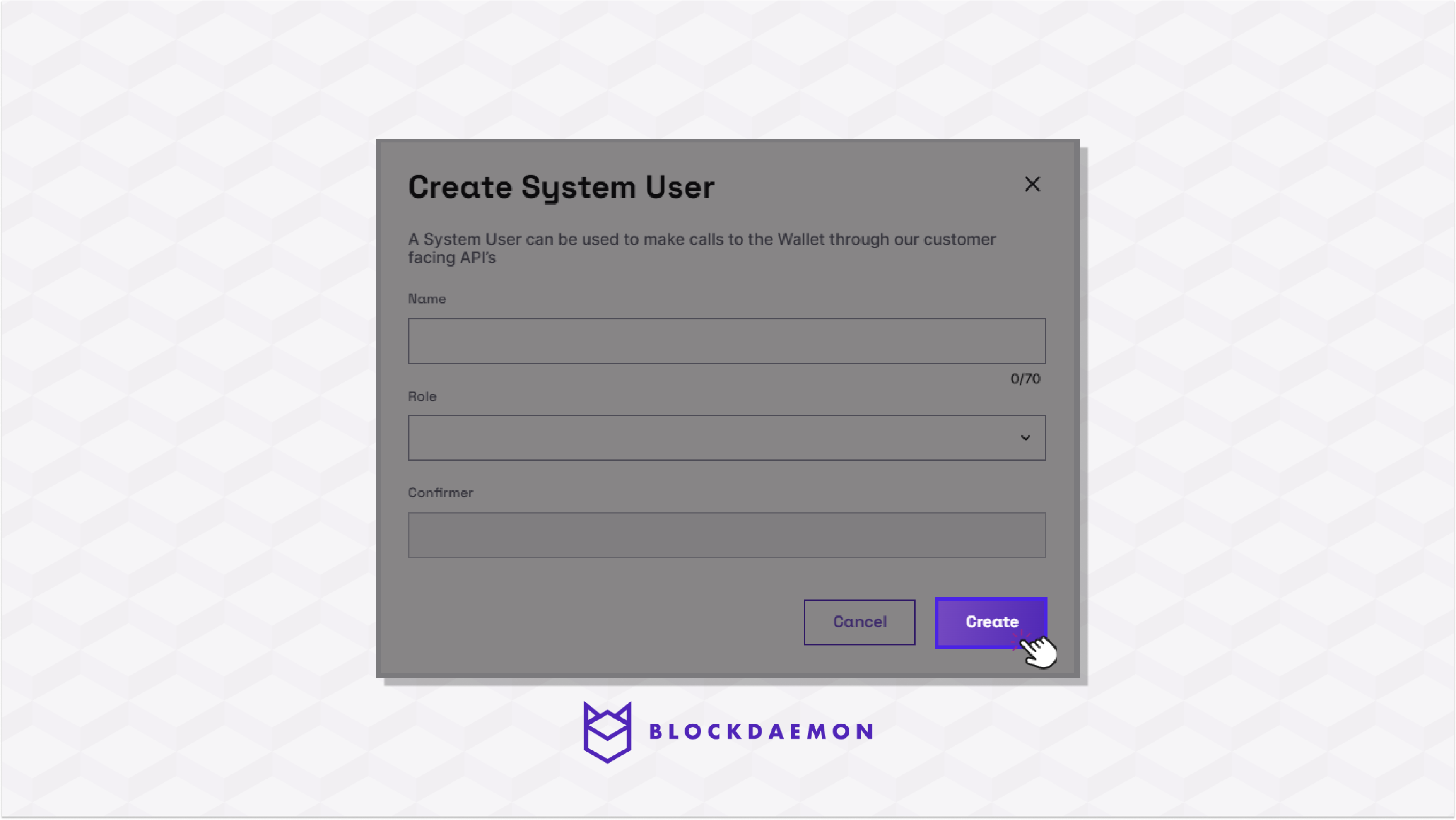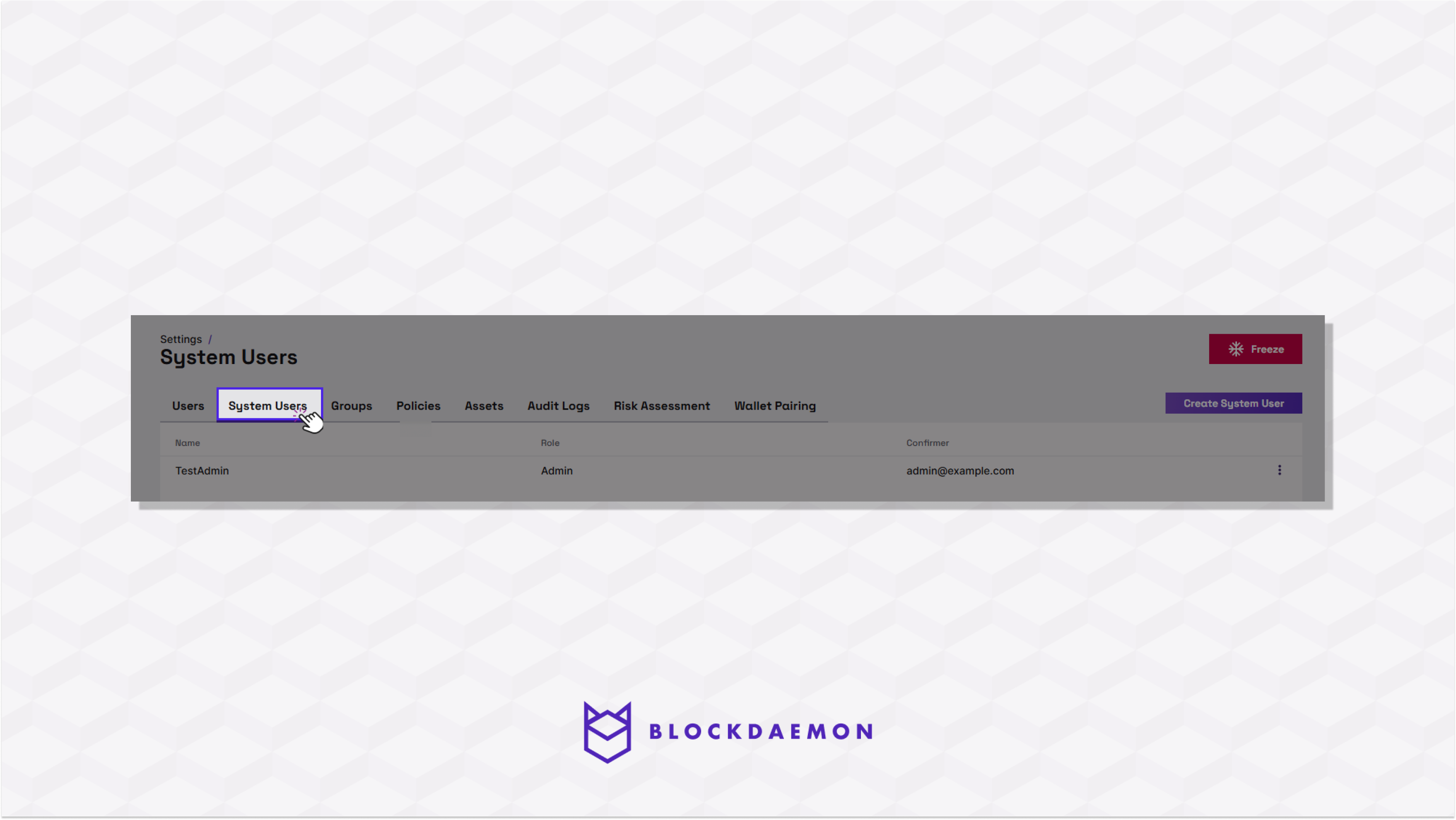 The system user is the one who may approve or deny operation requests. Most system users are already set up before the wallet launches. However, you can add or enable a system user through the Institutional Vault's Settings menu. Creating a System User allows an Admin user to provide a Public Key to request the wallet on behalf of an already registered System User.