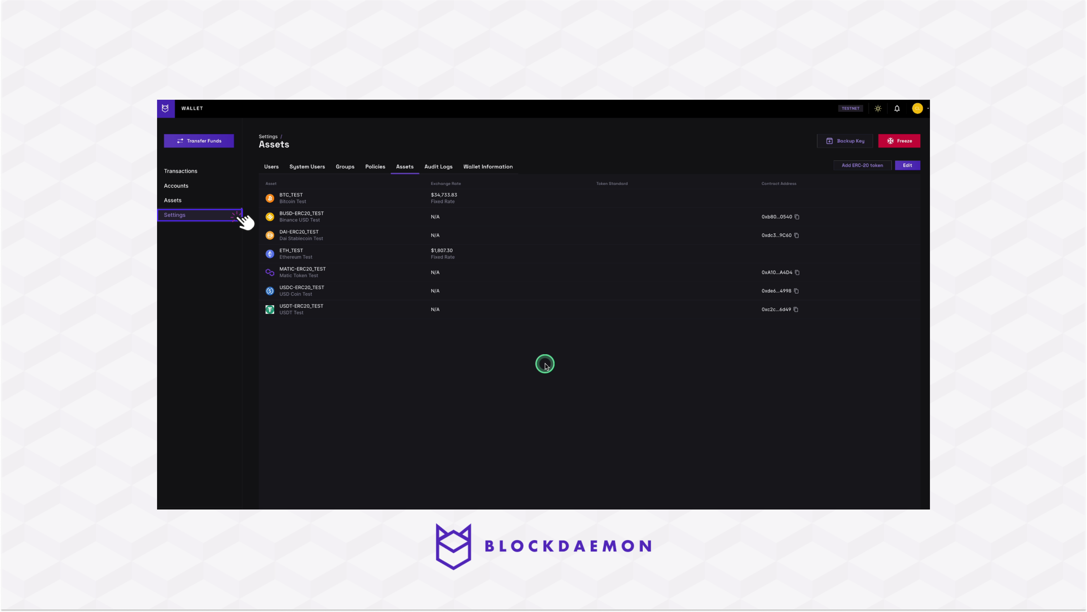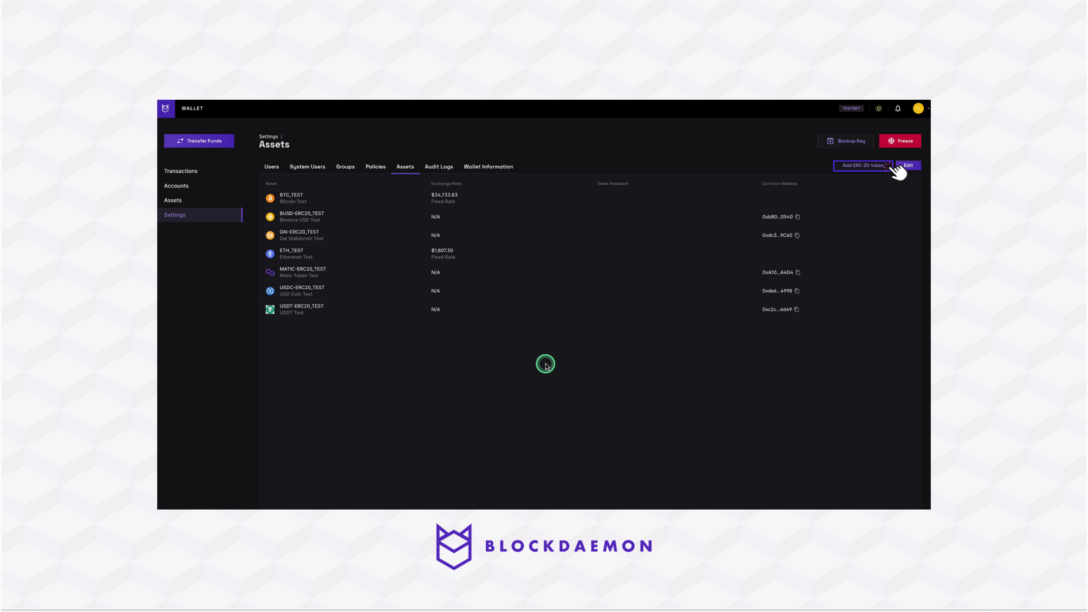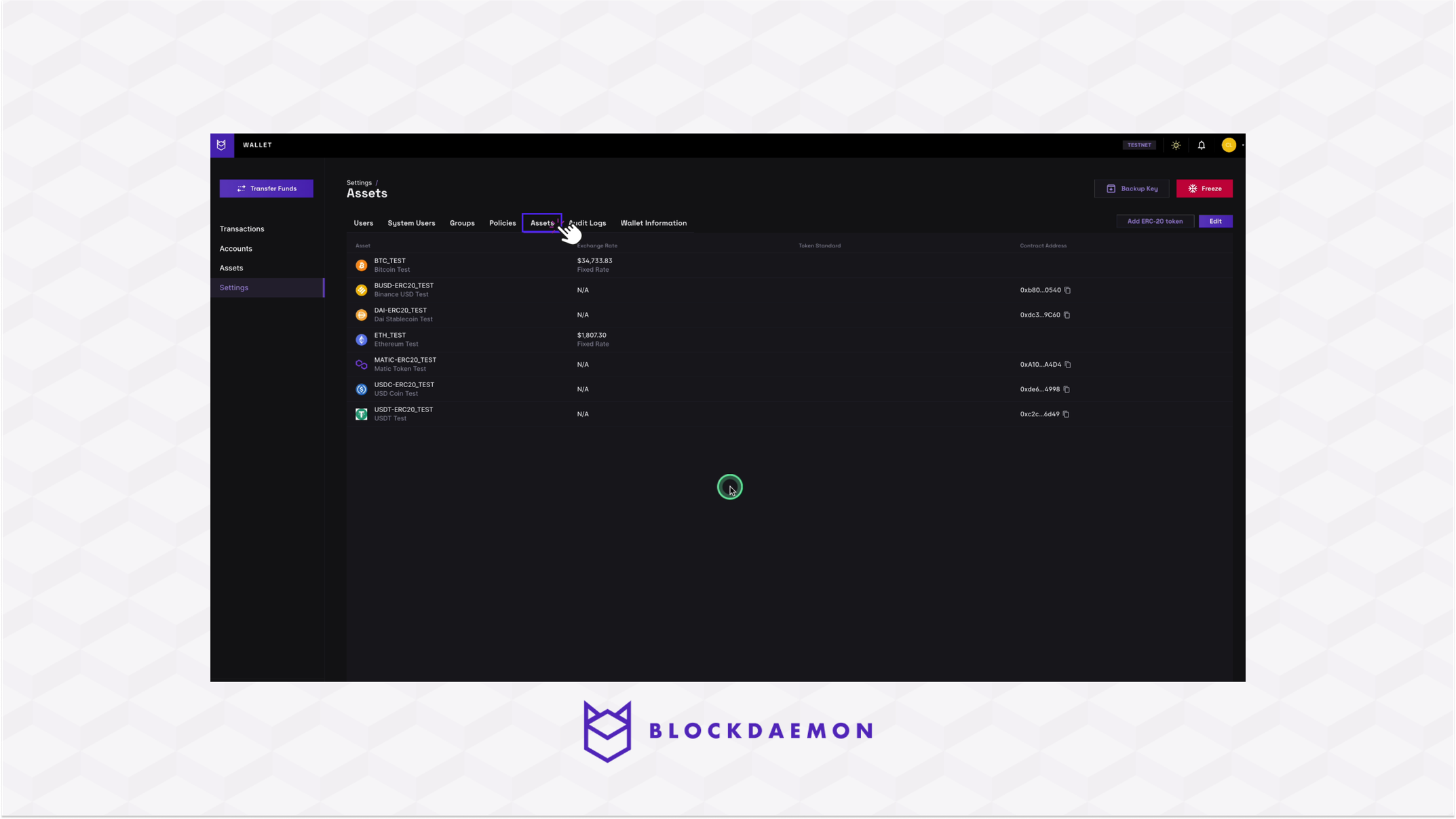 - Policy Settings: Blockdaemon proficiently manages the setting and enforcement of policies that govern the use of tokens, ensuring compliance and security throughout the token lifecycle.