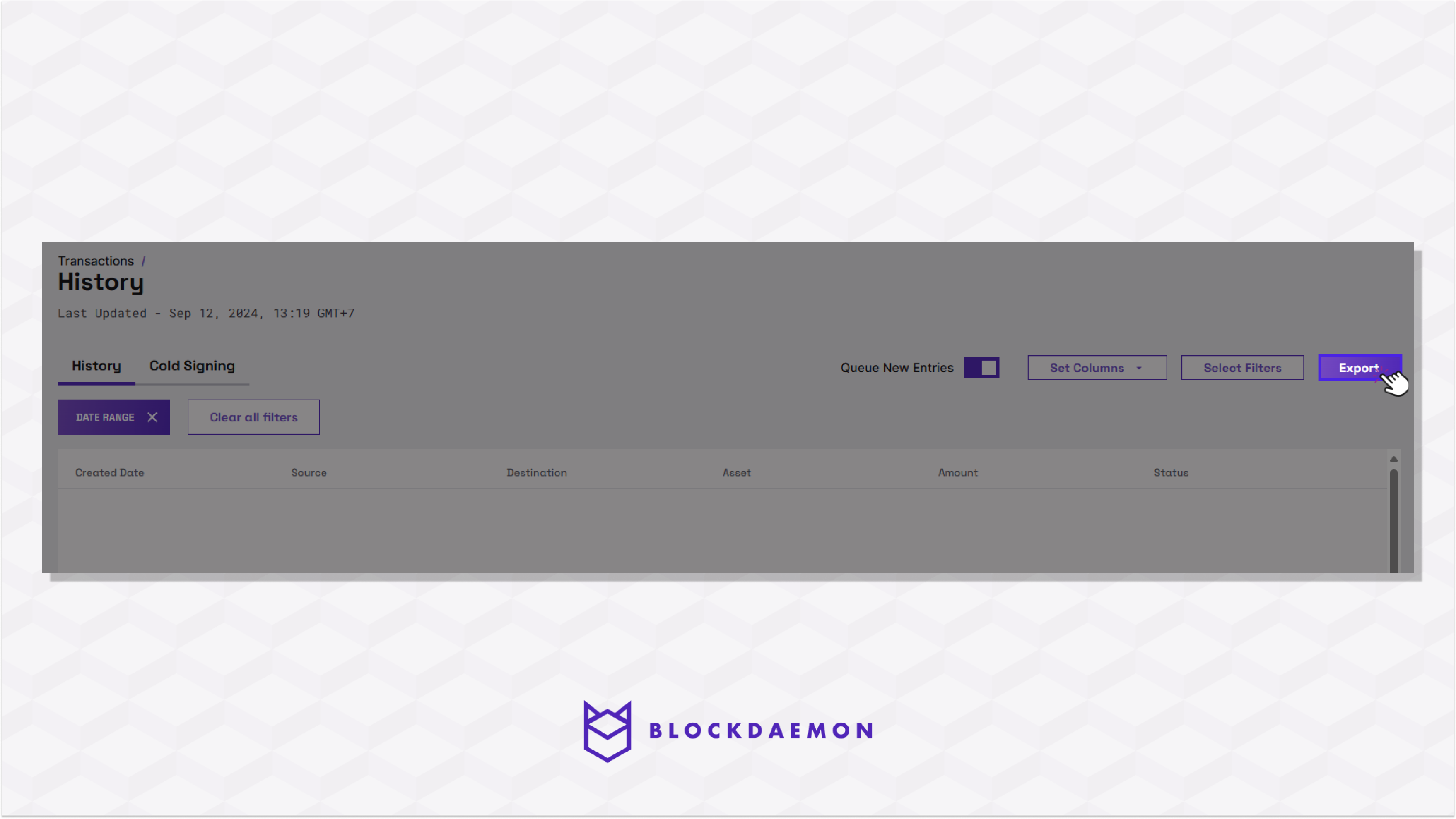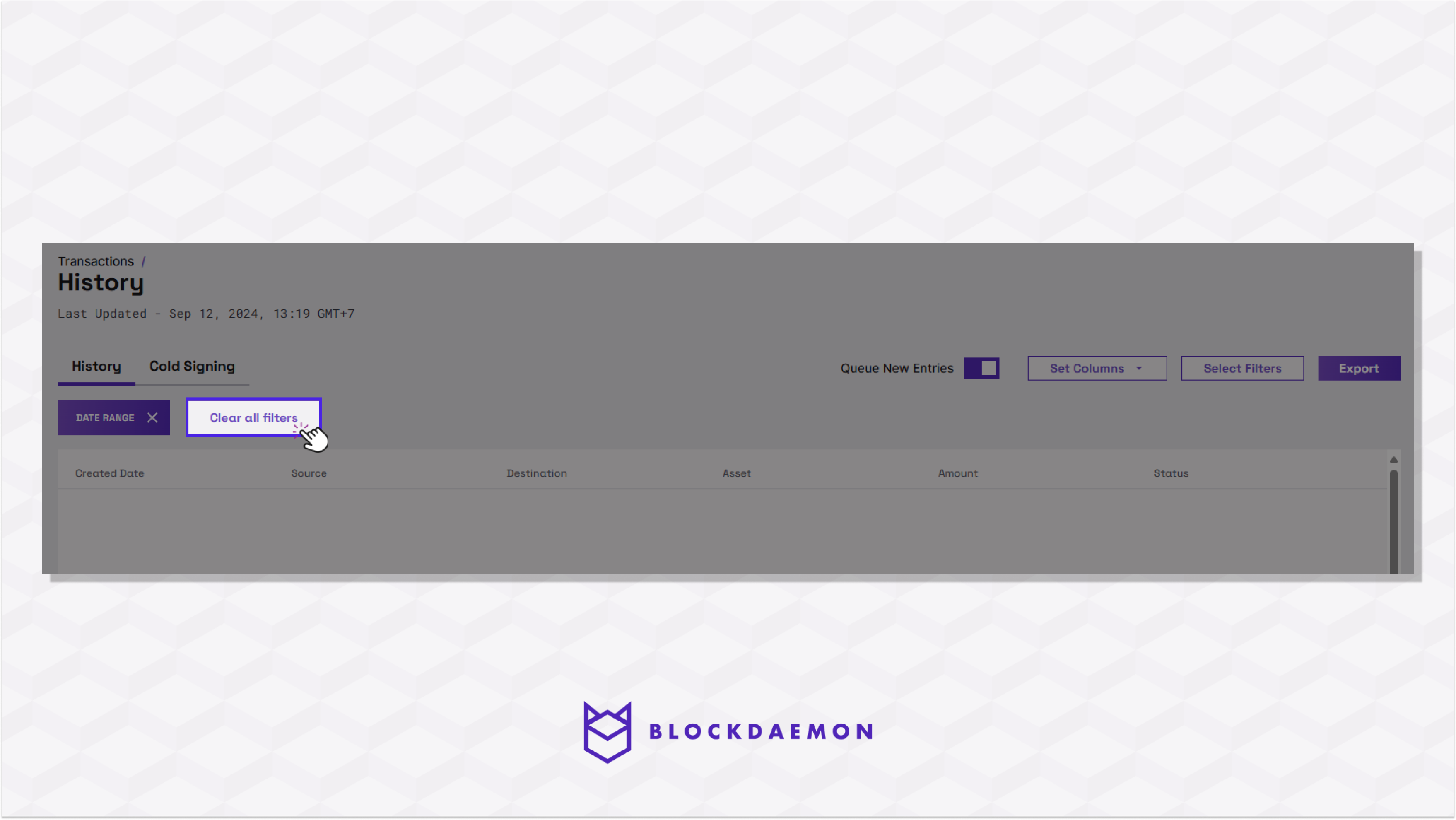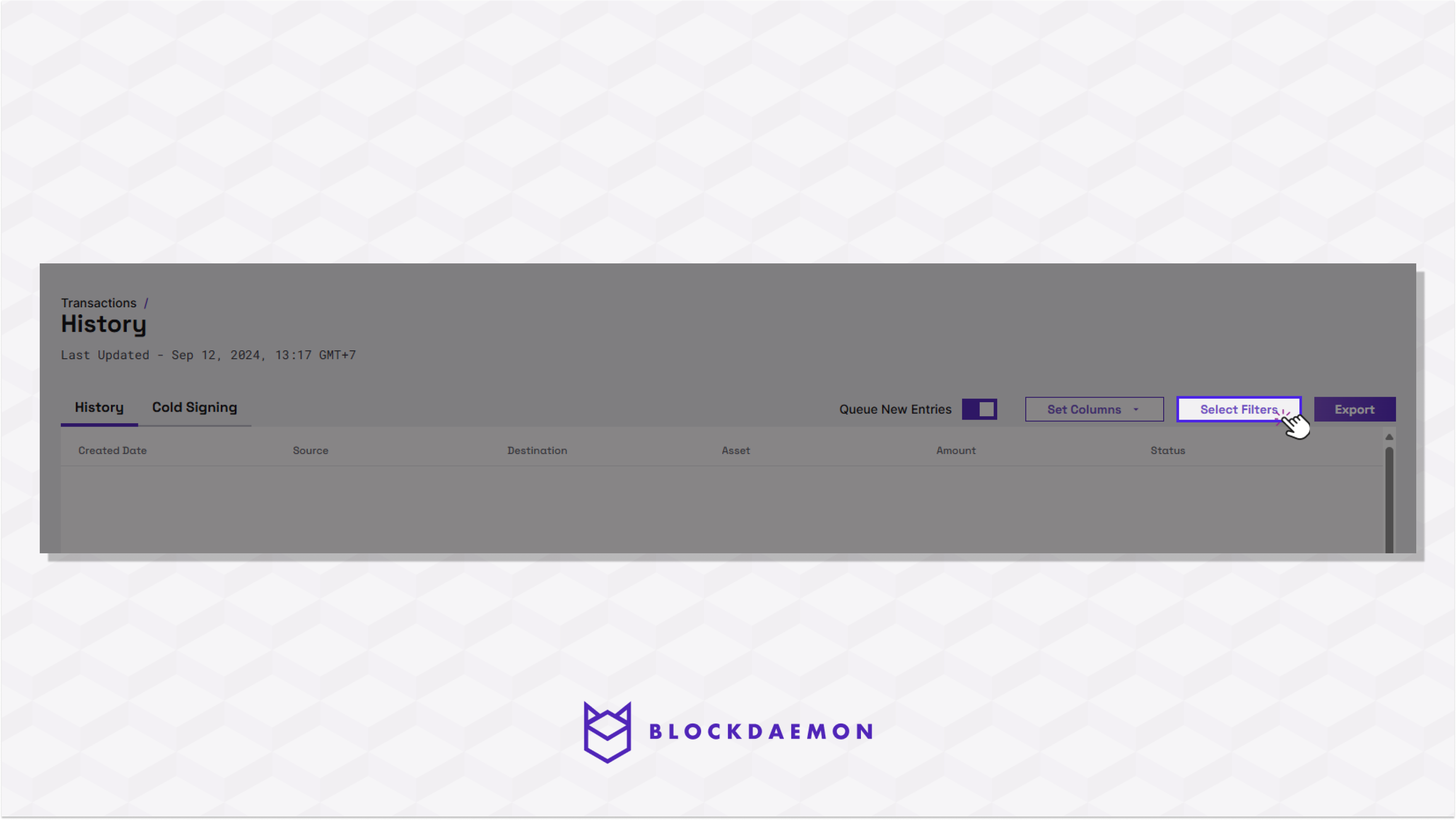 Under the Transaction History, you may examine every received or initiated transaction in the Institutional Vault. The history is shown in a table that may be filtered according to your needs.