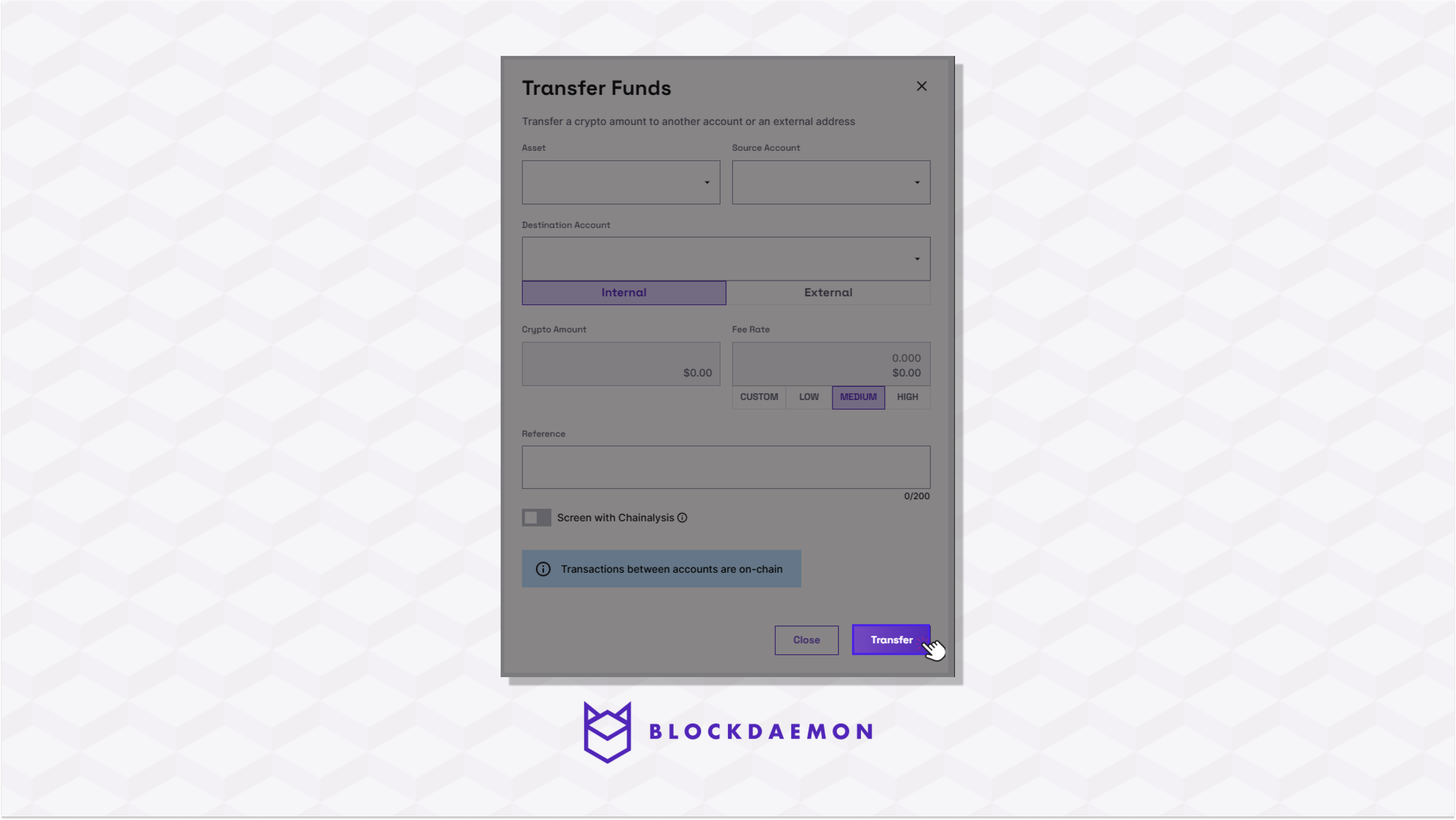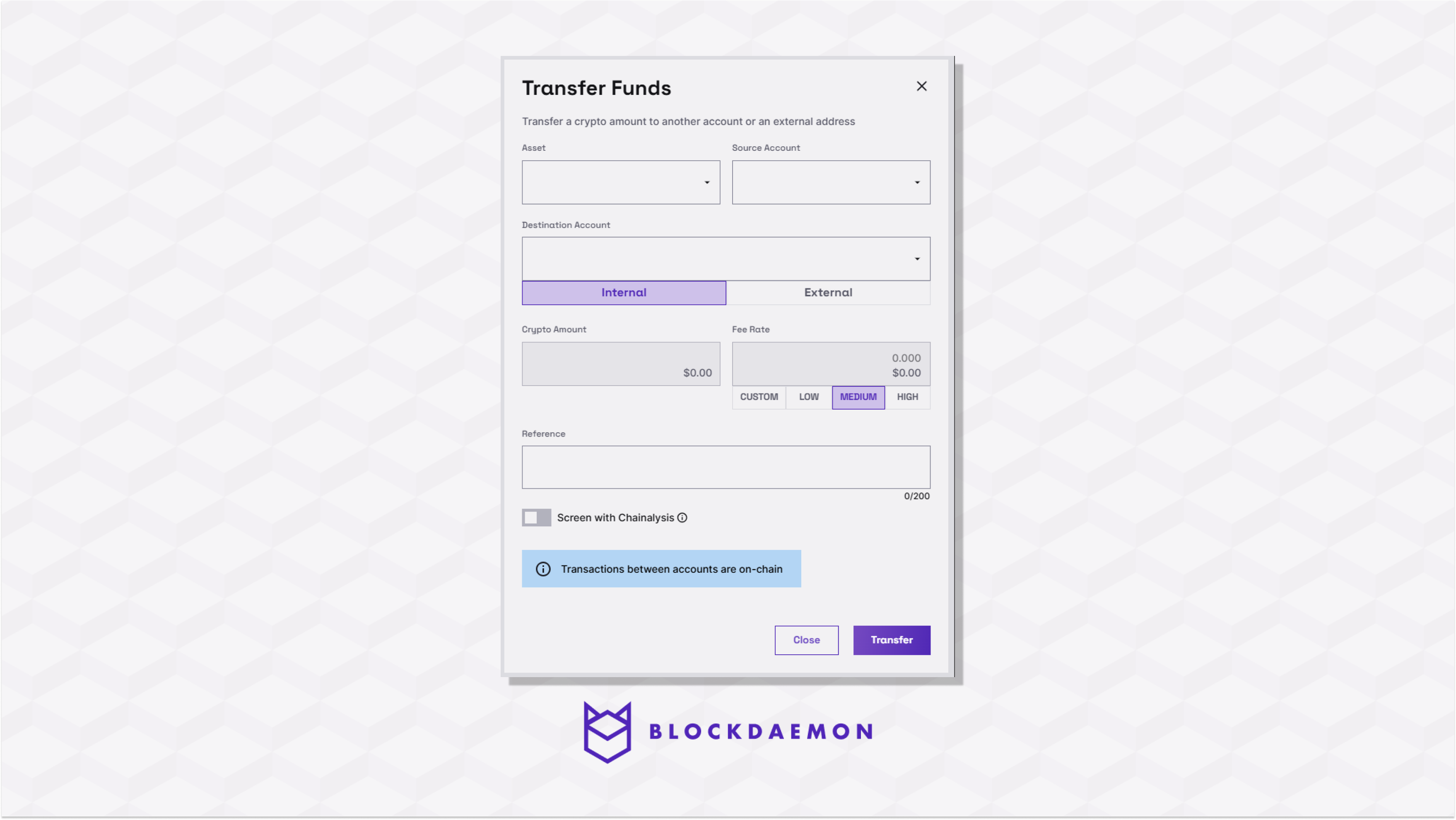 Internal Wallet | - An internal wallet ensures the same instance controls account transfers. It is also used when the sender and receiver addresses are within the same wallet.