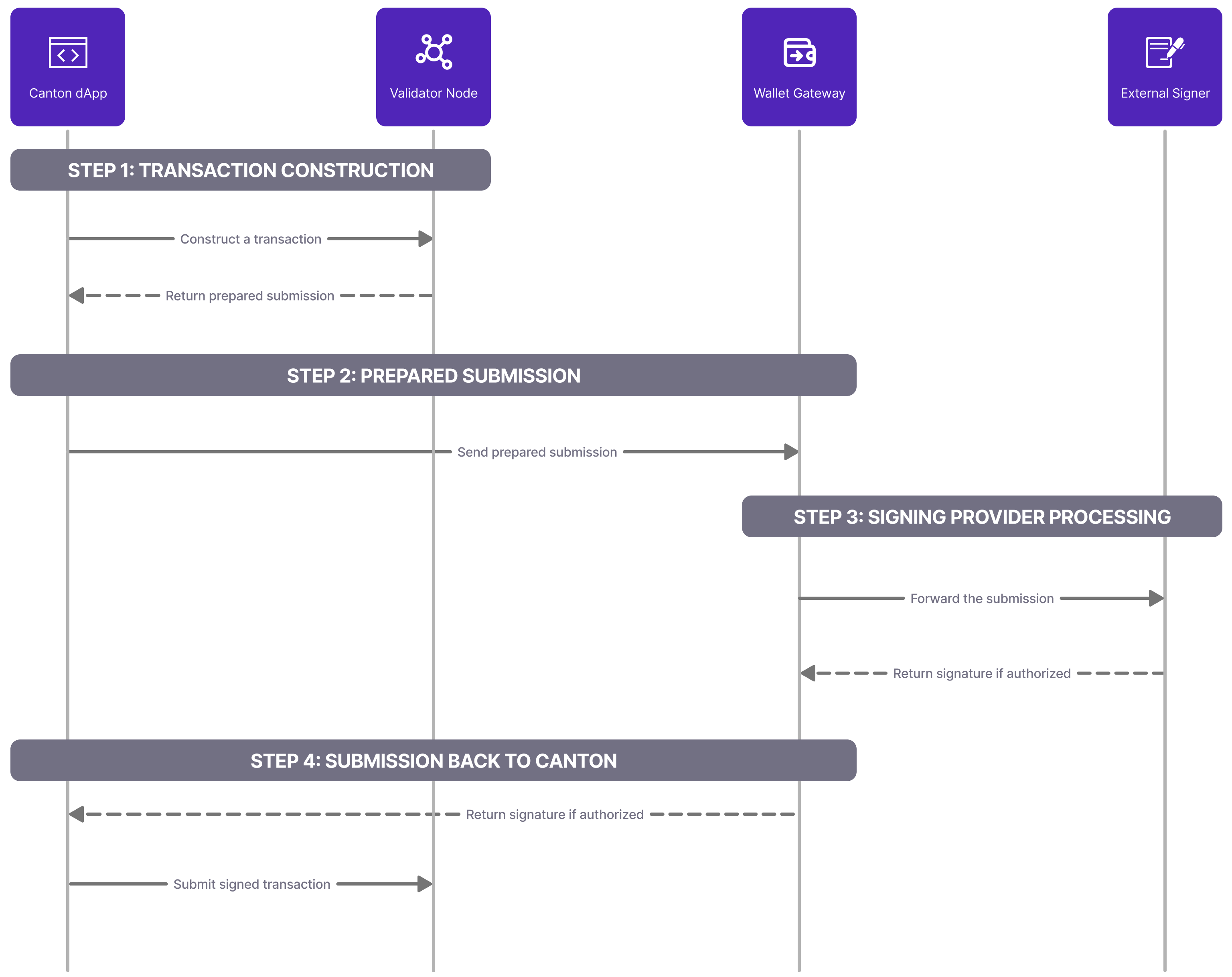 - The dApp (or an associated service) receives the signature and submits the fully signed transaction to the appropriate validator node.