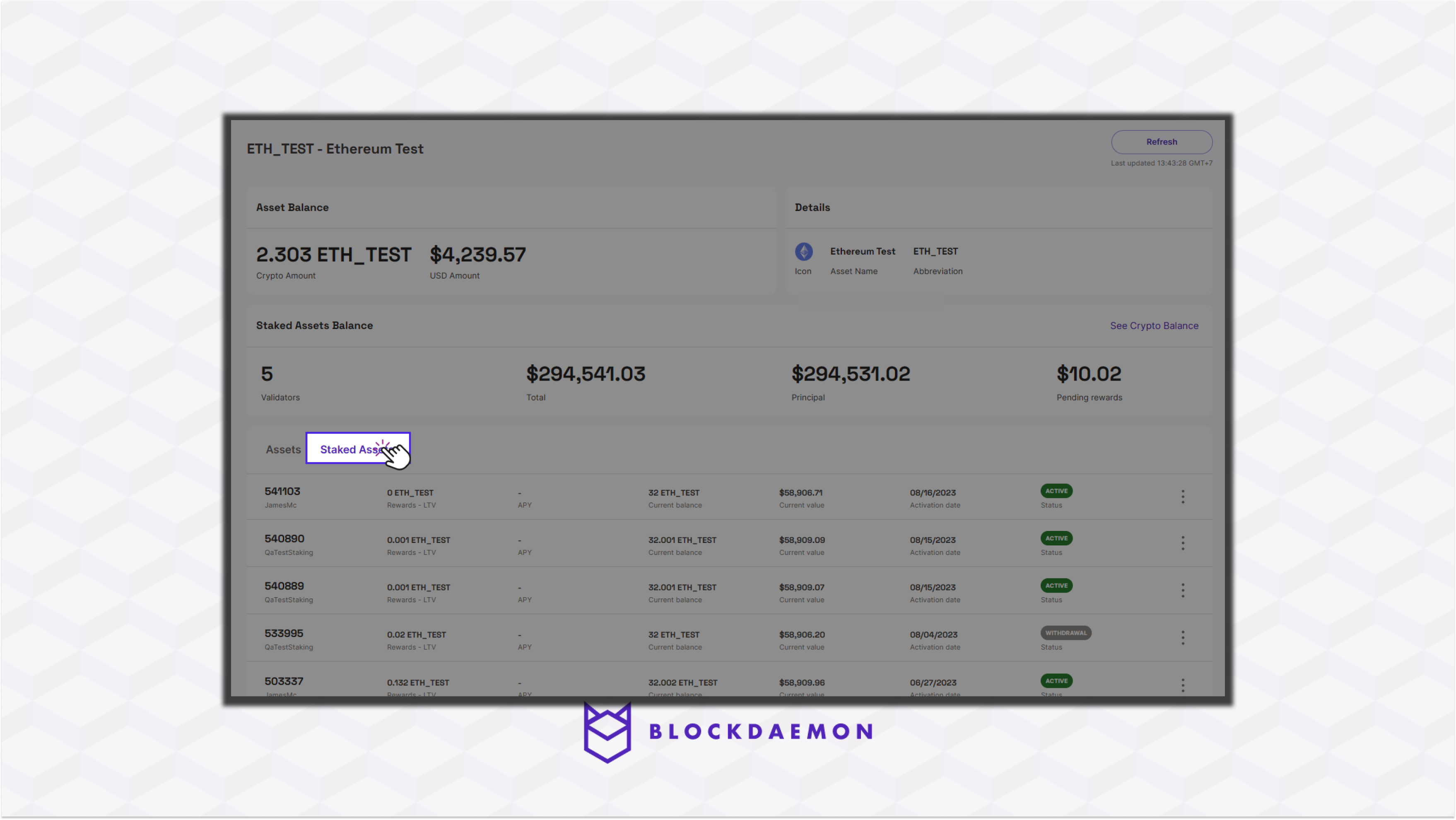 To stake an asset in your Institutional Vault via assets tab, follow the steps below: