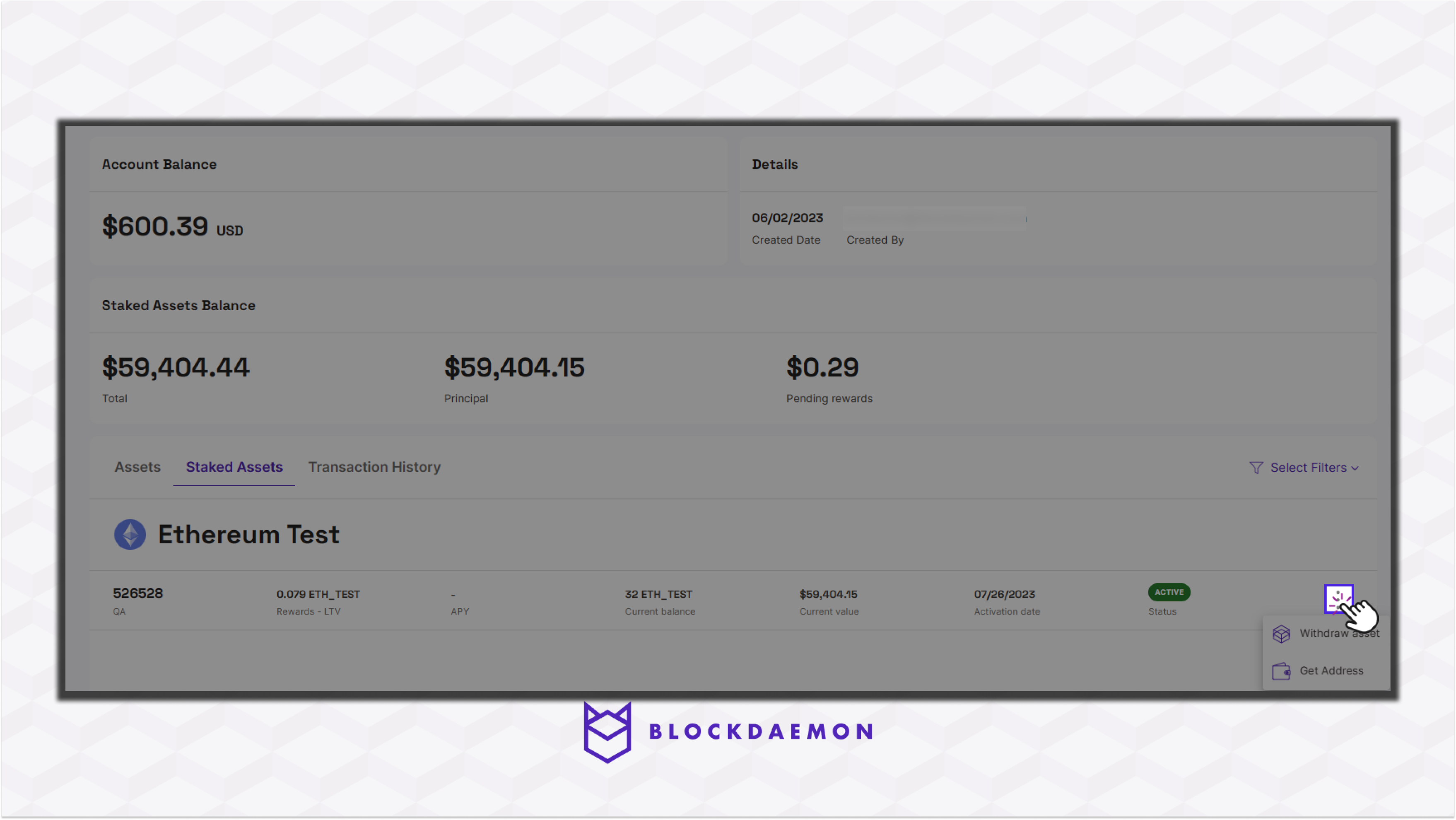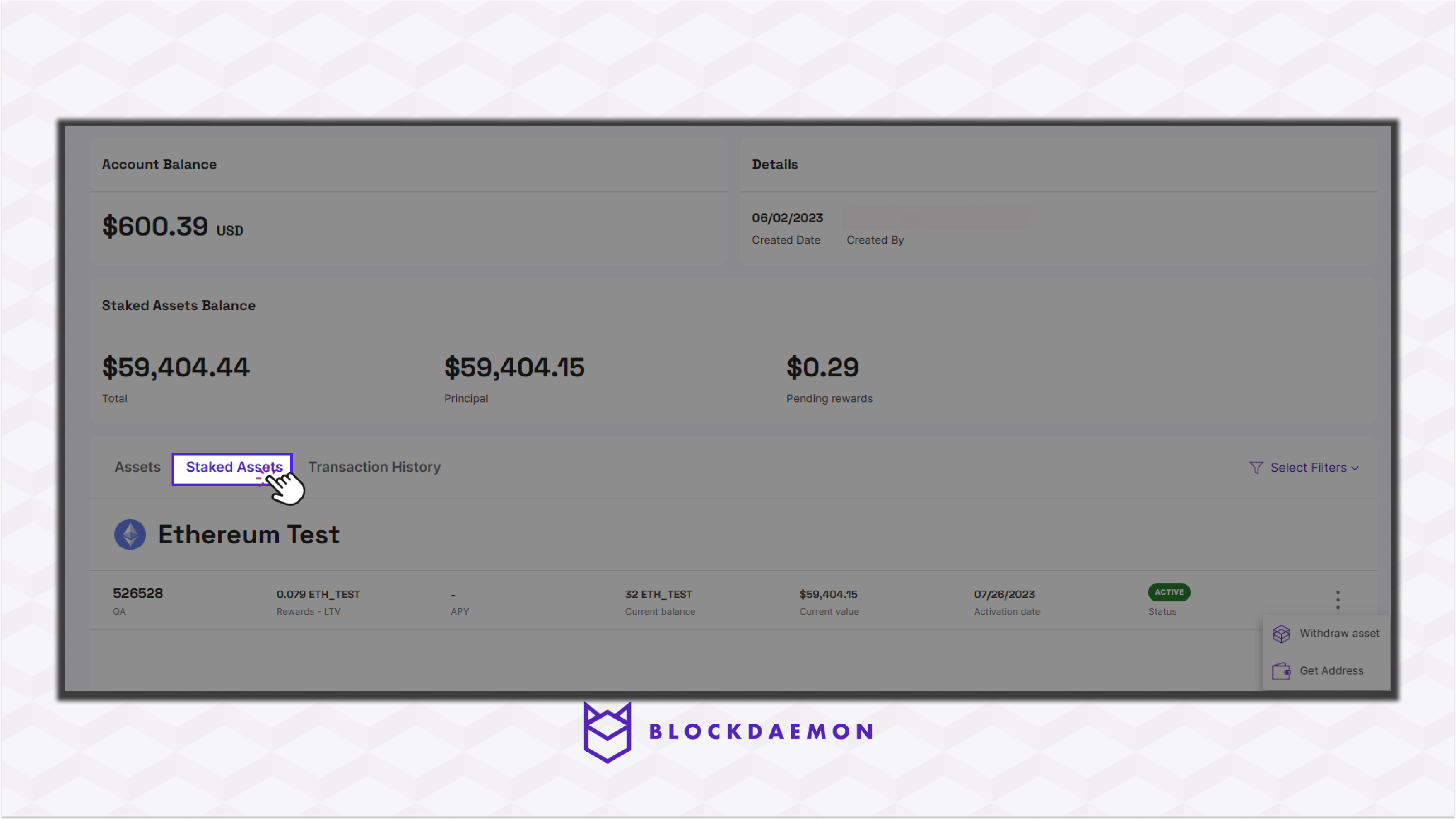 To stake an asset in your Institutional Vault via account tab, follow the steps below: