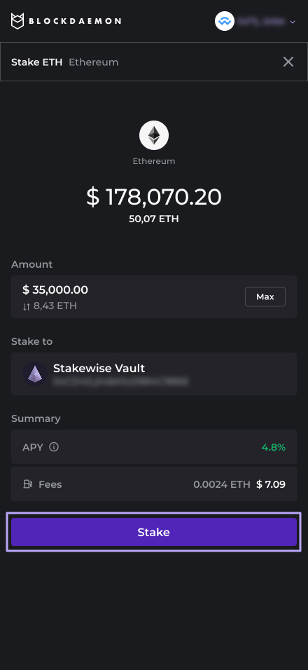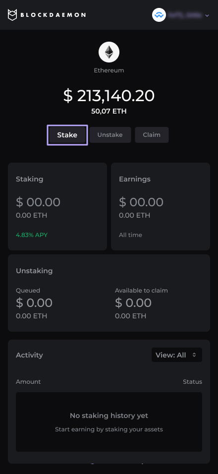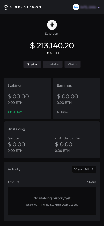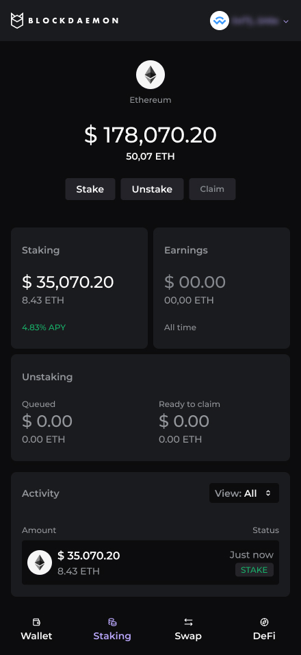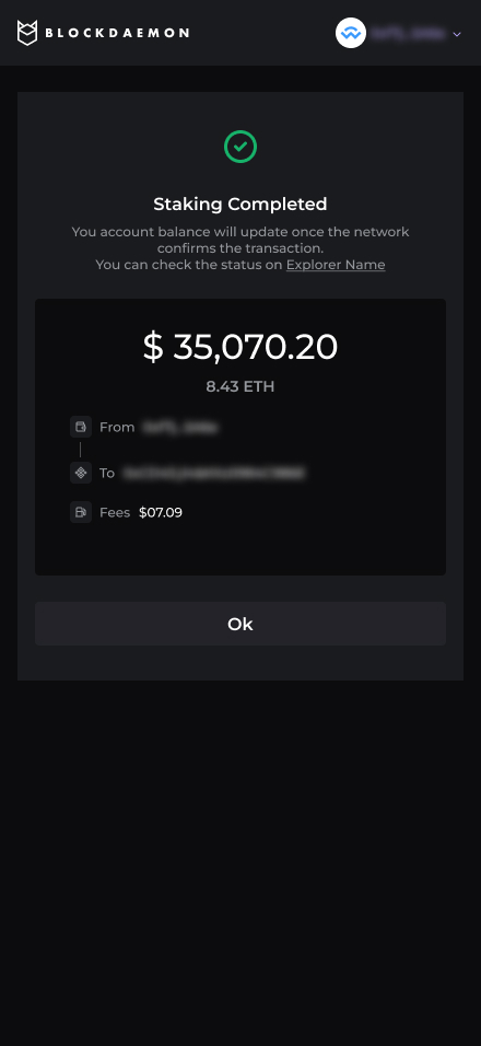 The Ethereum Stake Flow lets users delegate ETH from their connected Ethereum wallet to Blockdaemon’s validator to start earning rewards via the Earn Widget.